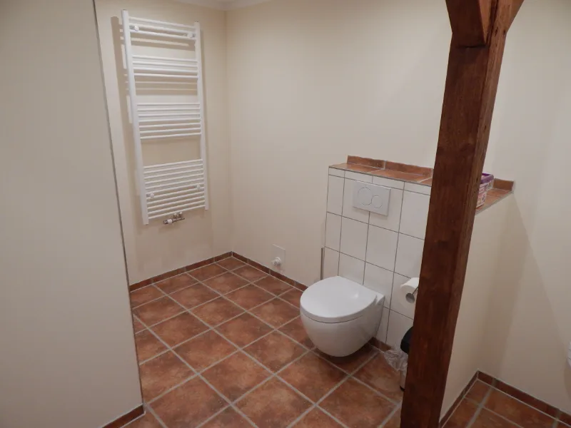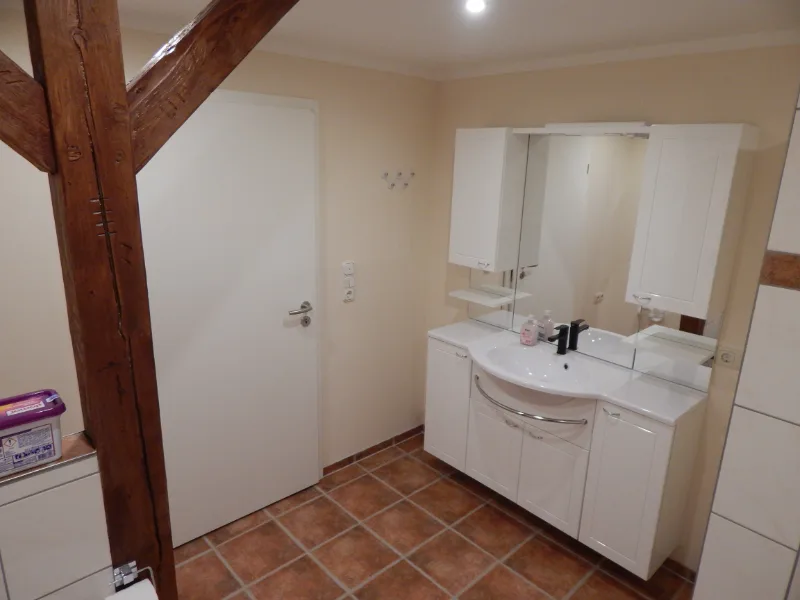 Badezimmer: Modernes Ambiente mit bodengleicher Dusche, Waschmaschine & Fußbodenheizung.